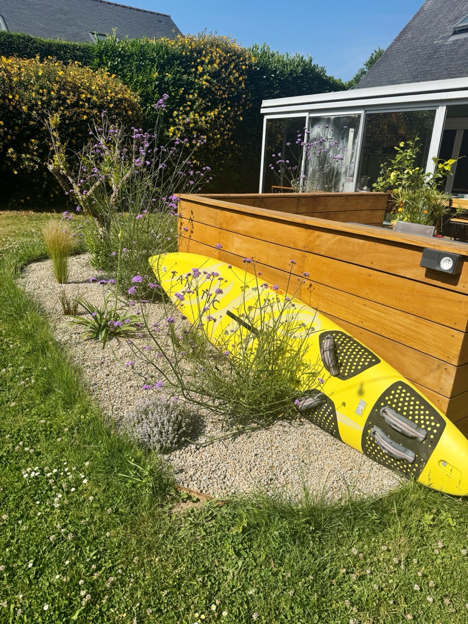 Un enrochement a été créé pour rattraper les niveaux du terrain, apportant également du relief et de la hauteur.