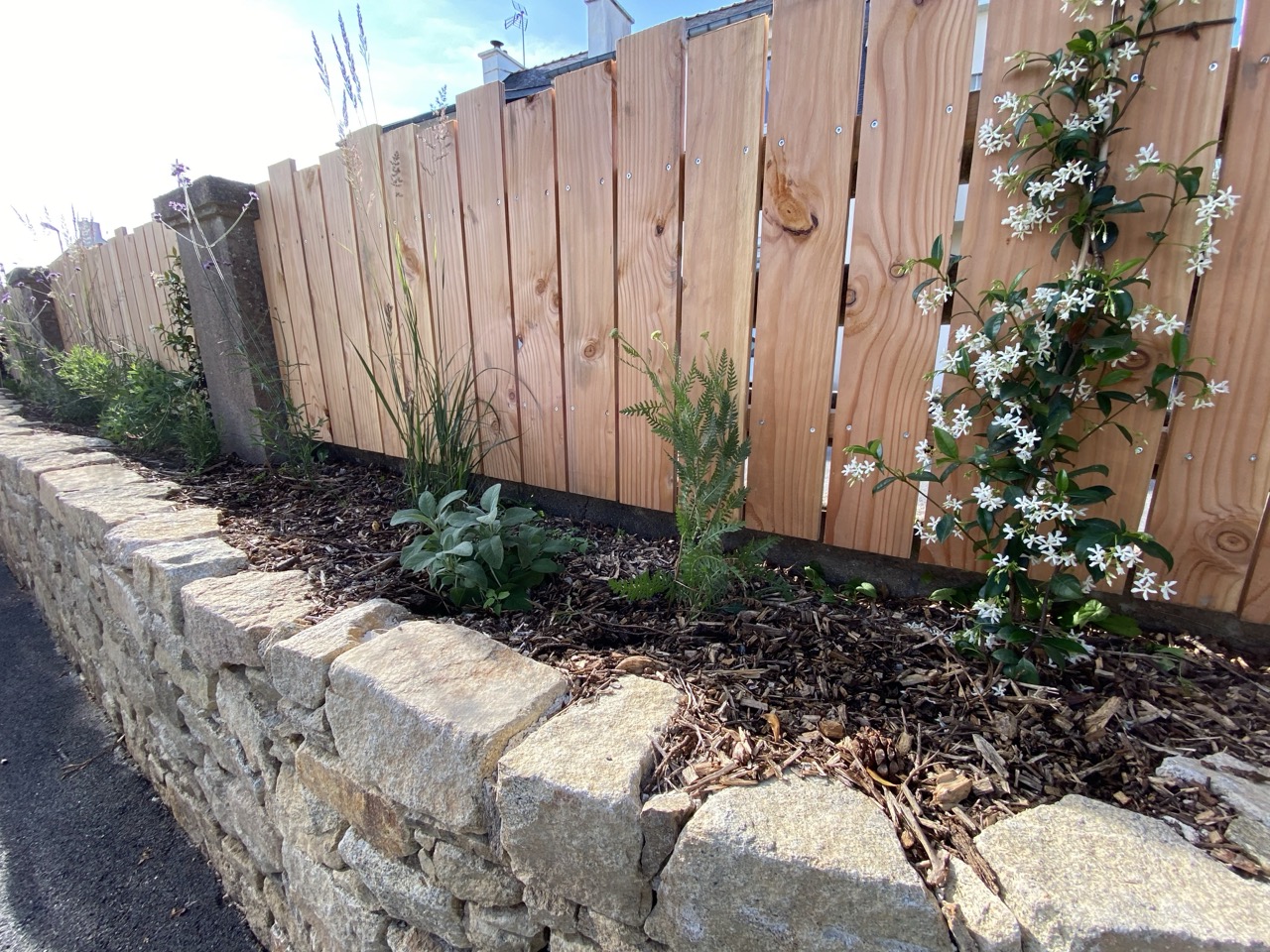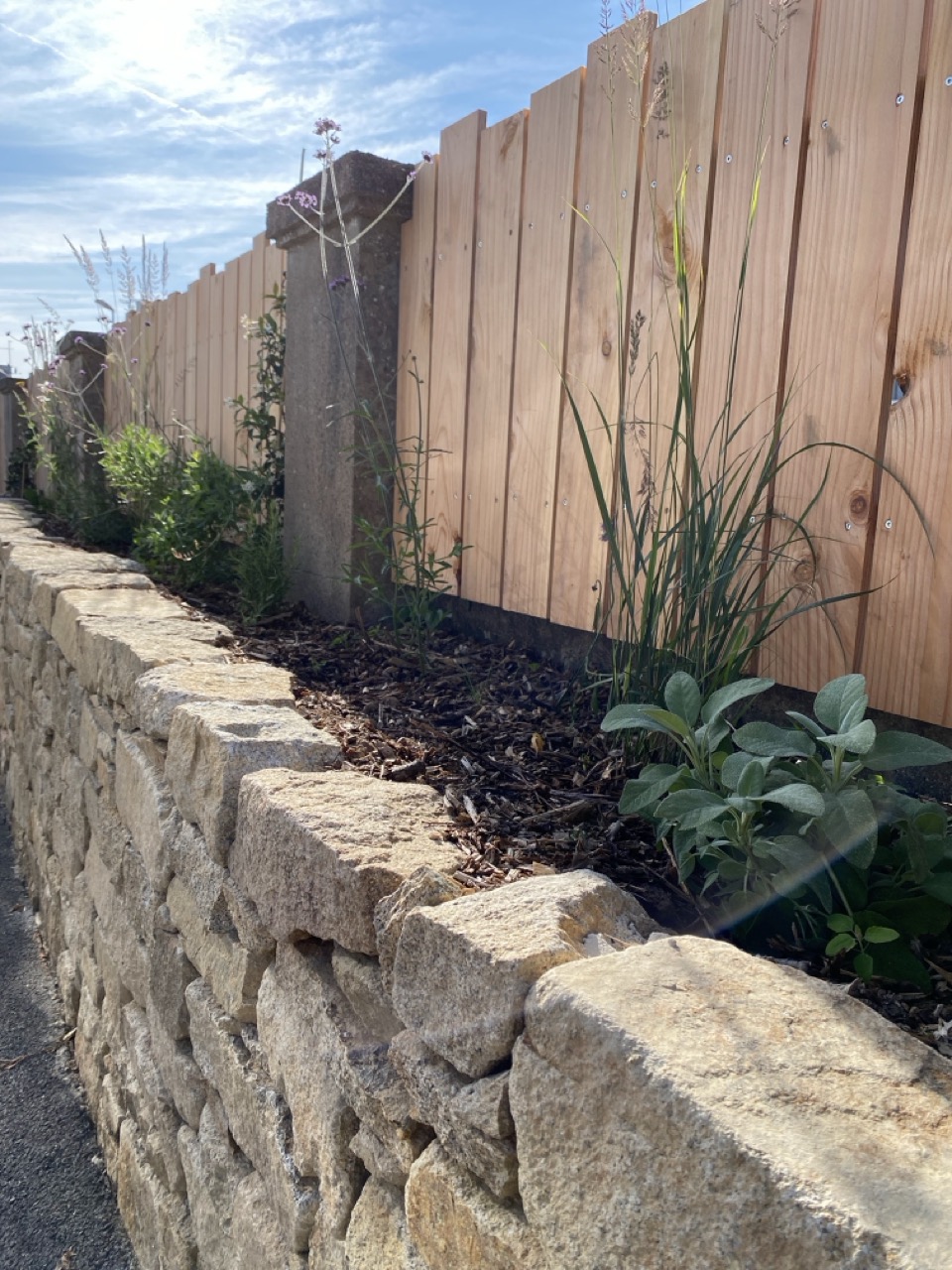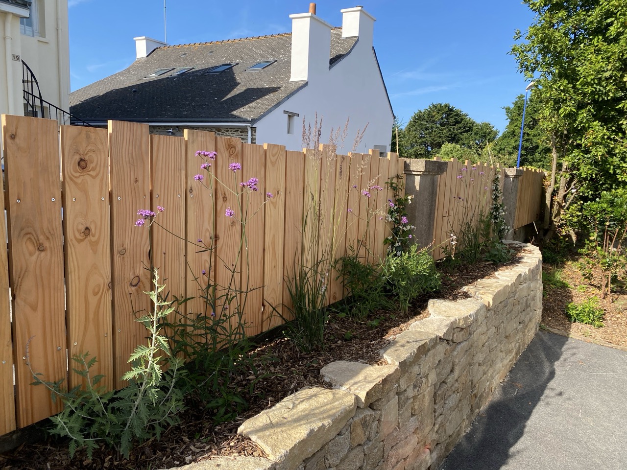 La proposition : une palissade en pin Douglas associée à une jardinière en pierre, montée en pierres sèches à la chaux.
