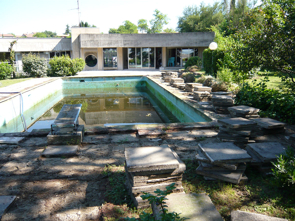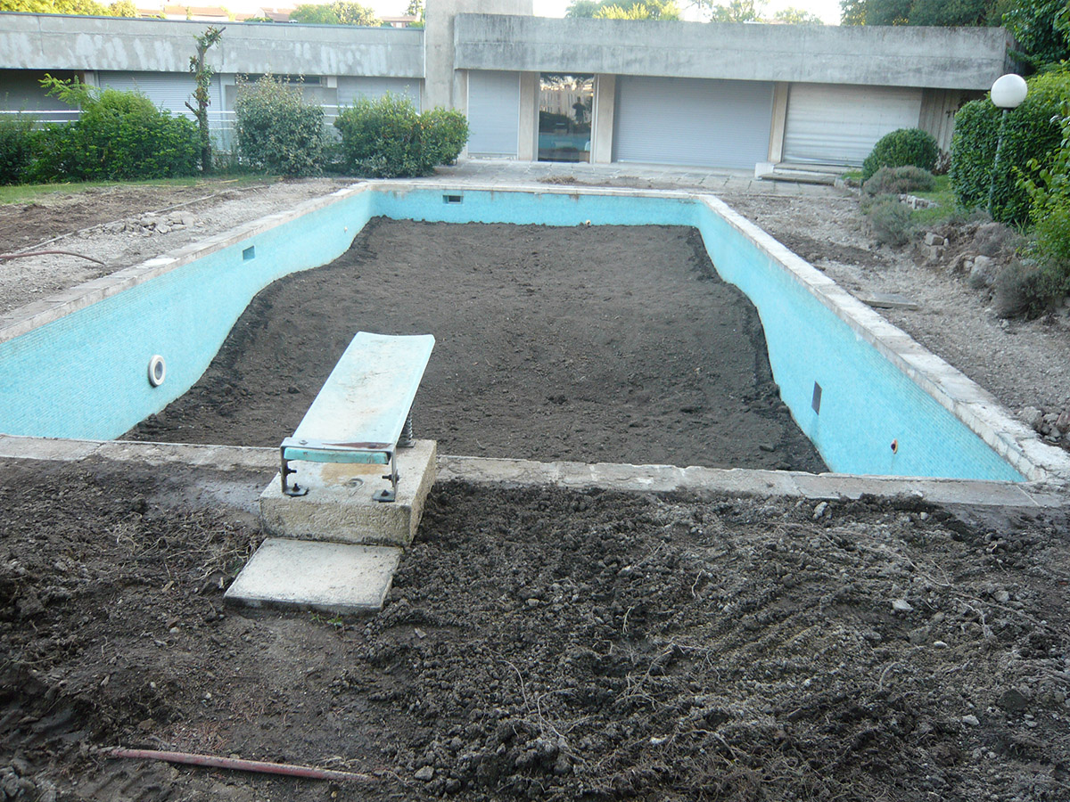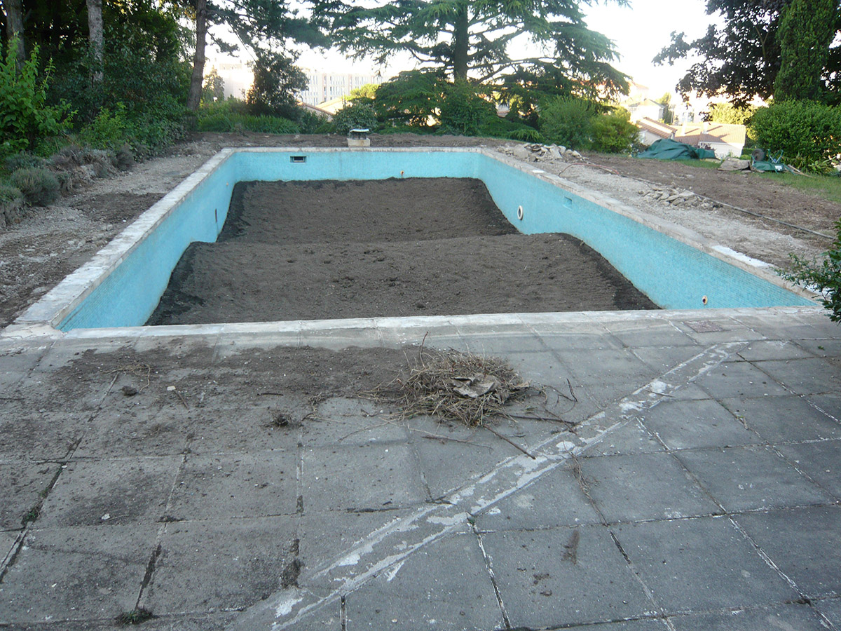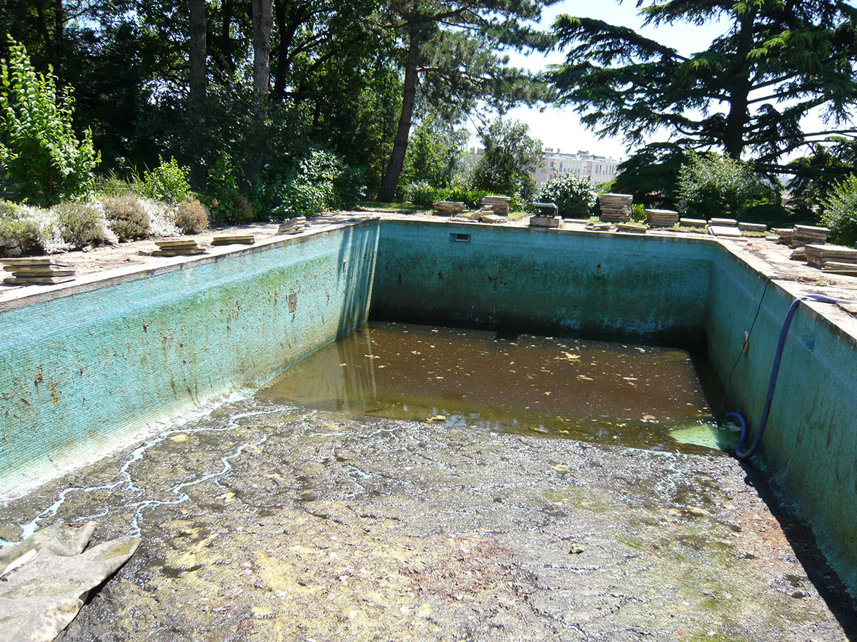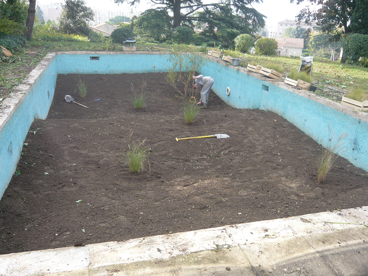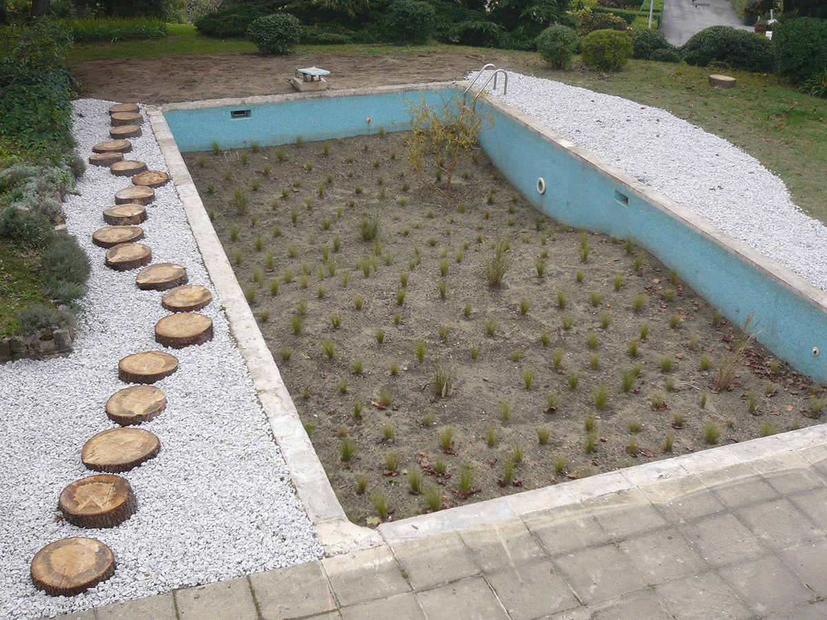 Plutôt que de reboucher une ancienne piscine, l’idée a été de la transformer en pièce maîtresse du jardin. Les carreaux bleus, l’échelle et même le plongeoir ont été conservés. À l’intérieur, un jardin a pris place, comme un bassin de plantes.