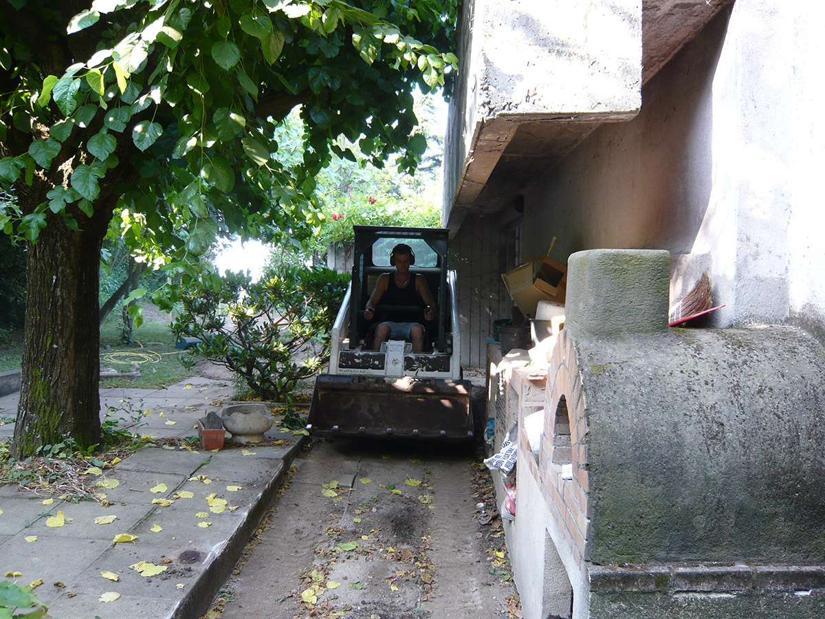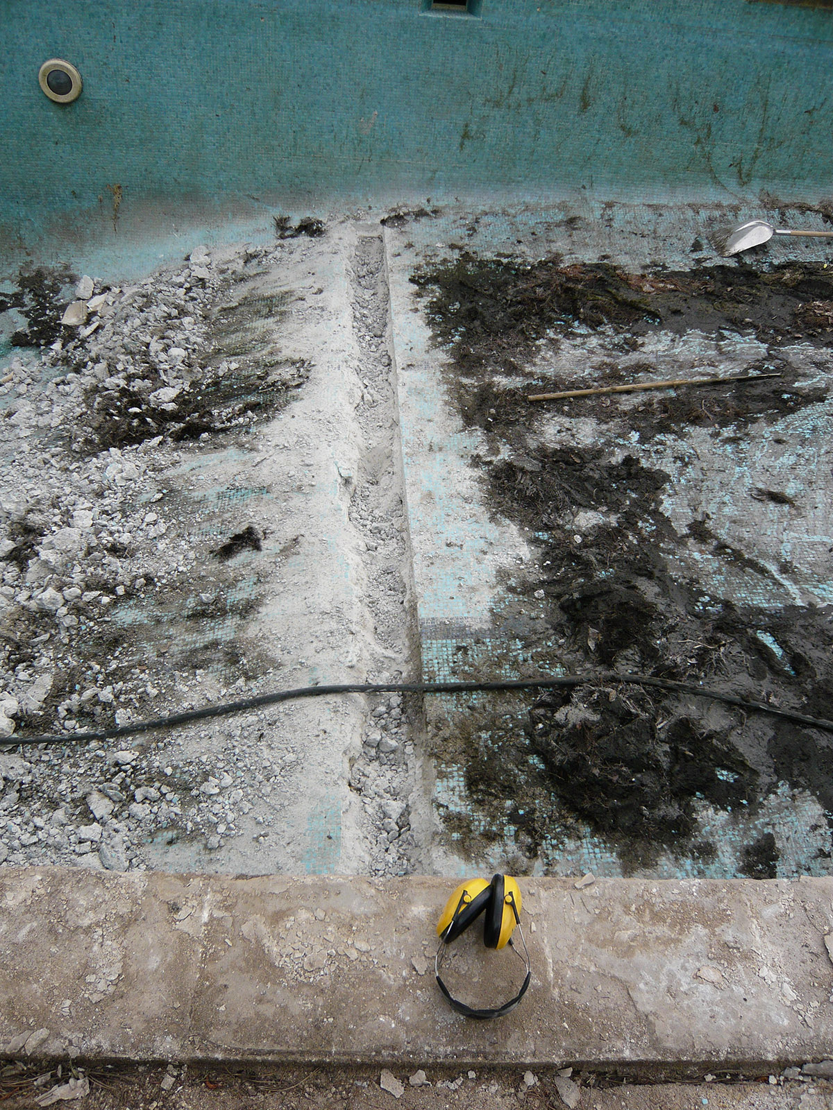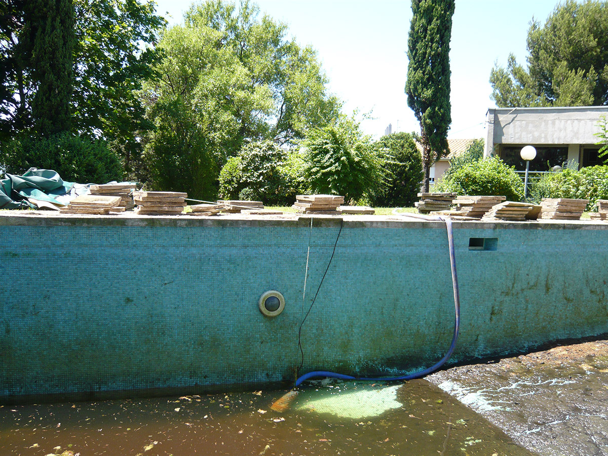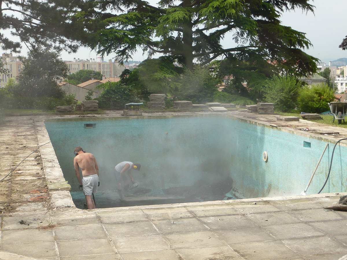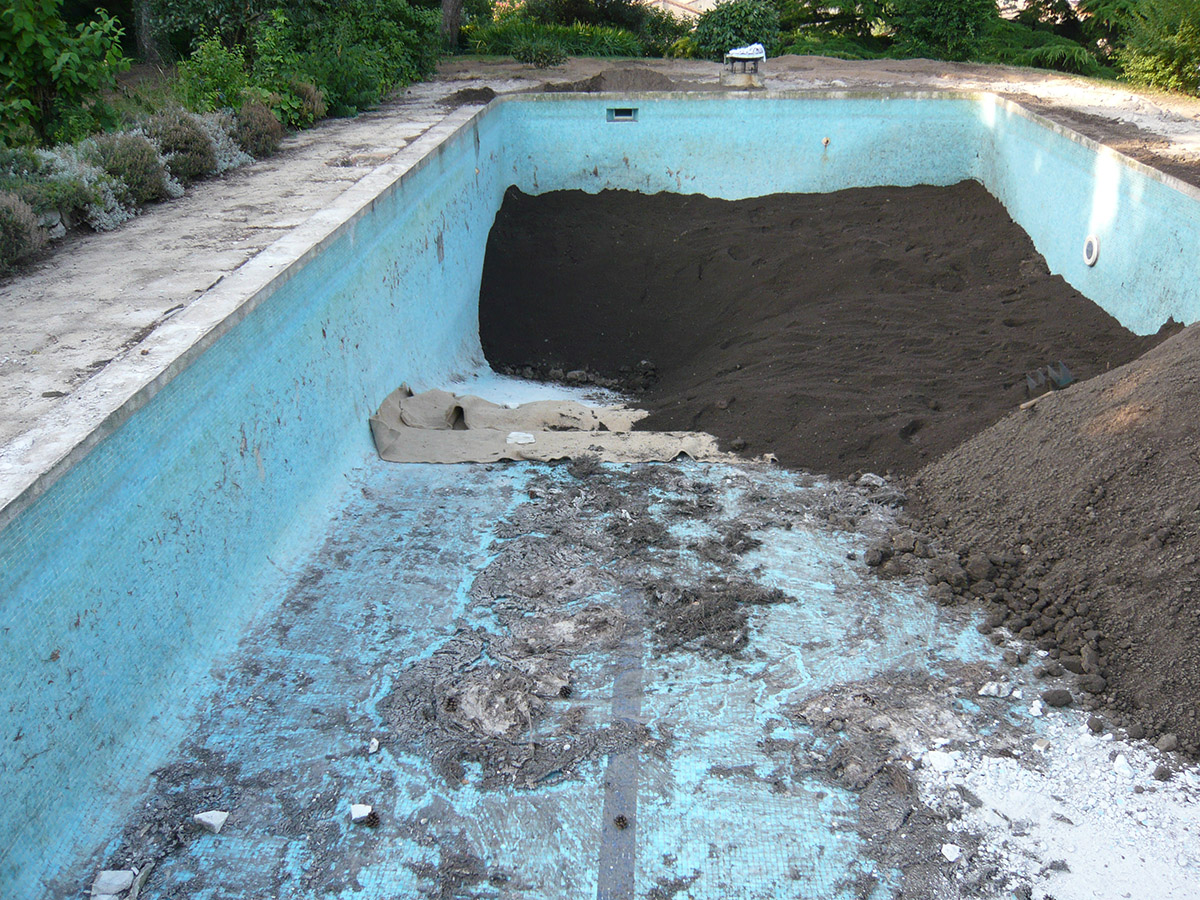 Plutôt que de reboucher une ancienne piscine, l’idée a été de la transformer en pièce maîtresse du jardin. Les carreaux bleus, l’échelle et même le plongeoir ont été conservés. À l’intérieur, un jardin a pris place, comme un bassin de plantes.